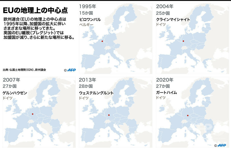 【2月1日 AFP】ドイツ・バイエルン(Bavaria)州北部の小さな村、ガートハイム(Gadheim)に、地元自治体、ドイツ、欧州連合(EU)の3種類の旗がはためいている一角がある。ここは、英国のEU離脱(ブレグジット、Brexit)後にEUの地理上の中心となる場所だ。