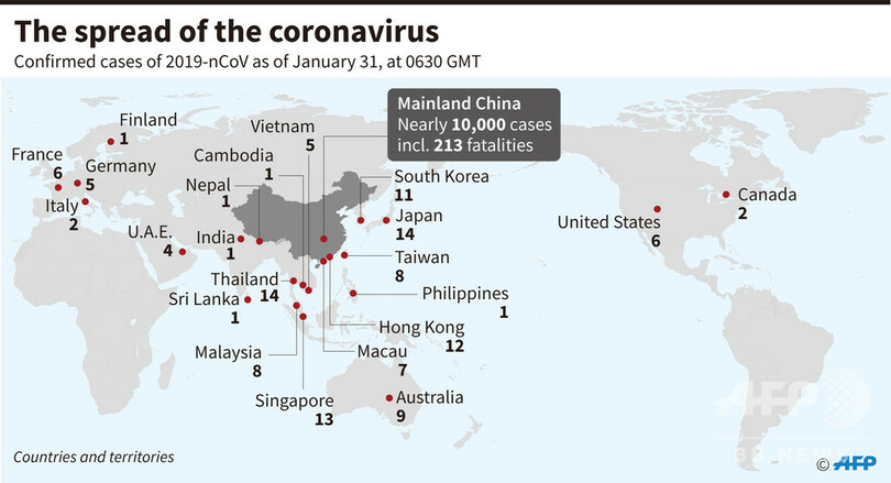 31日時点で213人が死亡、約1万人の感染を確認。感染者の大部分が武漢市内とその周辺に集中している。死者のほとんどは武漢地域で確認されたが、北京など同地域以外でも複数の死者が確認されている。