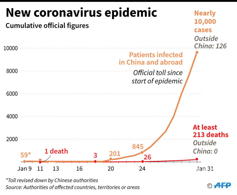 31日時点で213人が死亡、約1万人の感染を確認。感染者の大部分が武漢市内とその周辺に集中している。死者のほとんどは武漢地域で確認されたが、北京など同地域以外でも複数の死者が確認されている。
