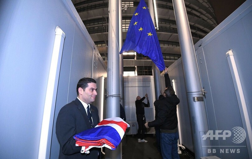 英国はベルギー時間2月1日午前0時(日本時間同8時)にEUを離脱する。EU主要機関では、その4時間ほど前に英国旗が降納された。英国旗の代わりには青地に金の星があしらわれた欧州旗が掲げられ、残る27加盟国の国旗と並んだ。(c)AFP