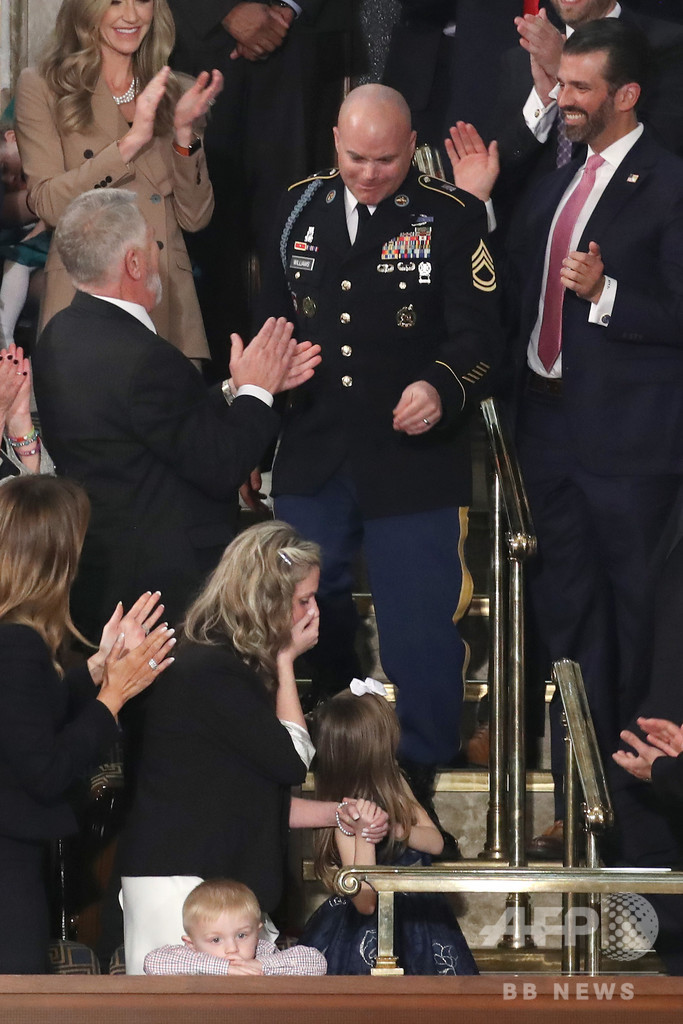 アフガン派遣の米兵一家、涙の再会 トランプ氏が一般教書演説で演出