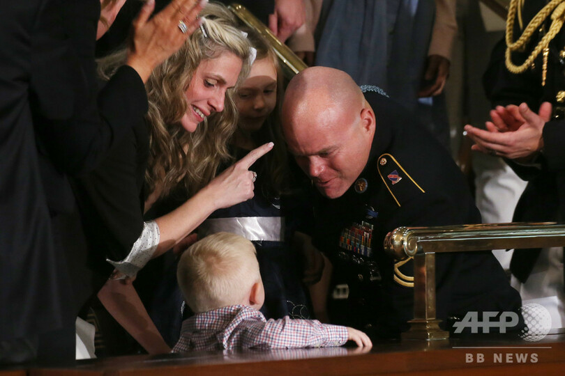 アフガン派遣の米兵一家、涙の再会 トランプ氏が一般教書演説で演出