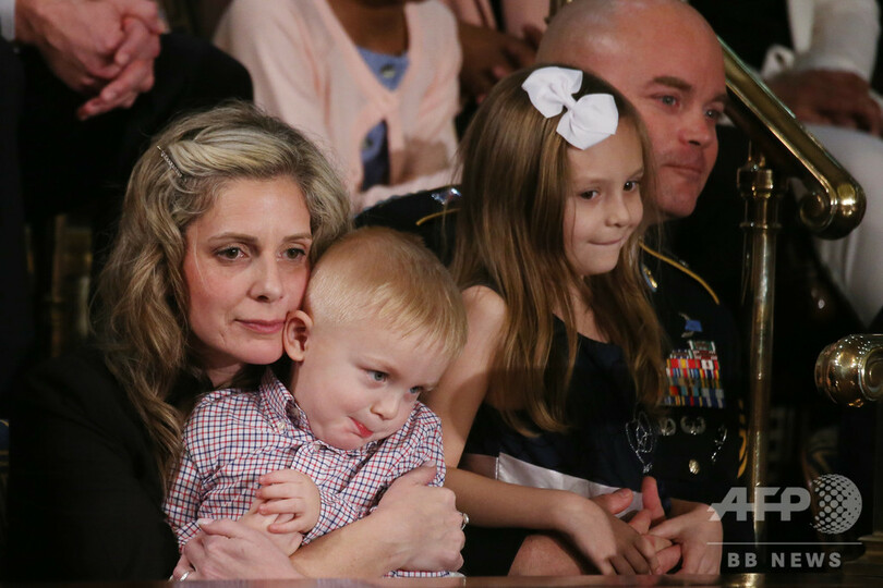 「彼は今夜ここに来ている。これ以上待たせるわけにもいかない」とトランプ氏が言うと、正装用の軍服姿で左胸に記章を着けたウィリアムス軍曹が、家族の後方にある階段をゆっくりと下り、腰をかがめて子どもたちを抱き締めた後、妻と抱擁を交わした。(c)AFP