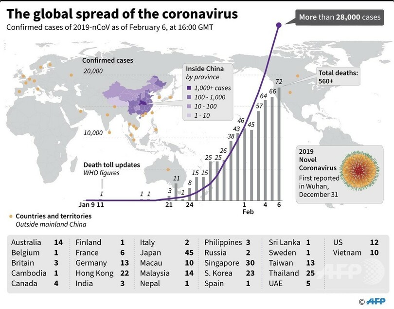 【2月7日 AFP】中国中部・湖北(Hubei)省武漢(Wuhan)の市場で発生し、世界中に拡散している新型コロナウイルスにより、これまでに560人以上が死亡した。