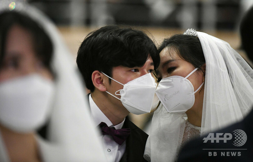 【2月14日 AFP】韓国・加平(Gapyeong)の清心平和ワールドセンター(Cheongshim Peace World Center)で、統一教会(世界基督教統一神霊協会、Unification Church、現:世界平和統一家庭連合)の合同結婚式にマスクを着けて参加するカップル。(c)AFP