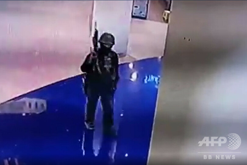 防犯カメラの映像には、ヘルメットと戦闘装備を身に着けた銃乱射犯、軍の上級曹長ジャカパン・トンマ(Jakrapanth Thomma)容疑者が、機関銃を肩に掛けてショッピングモール内を闊歩(かっぽ)する様子が映っていた。