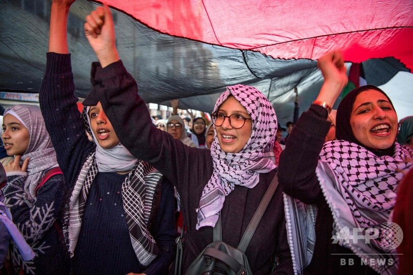 パレスチナの旗を手に、「パレスチナよ永遠なれ」と叫びながら市内を行進した人々は、米国を「平和の敵」と非難。「パレスチナは売り物ではない」とシュプレヒコールを上げ、米国製品のボイコットを呼び掛けた。(c)AFP
