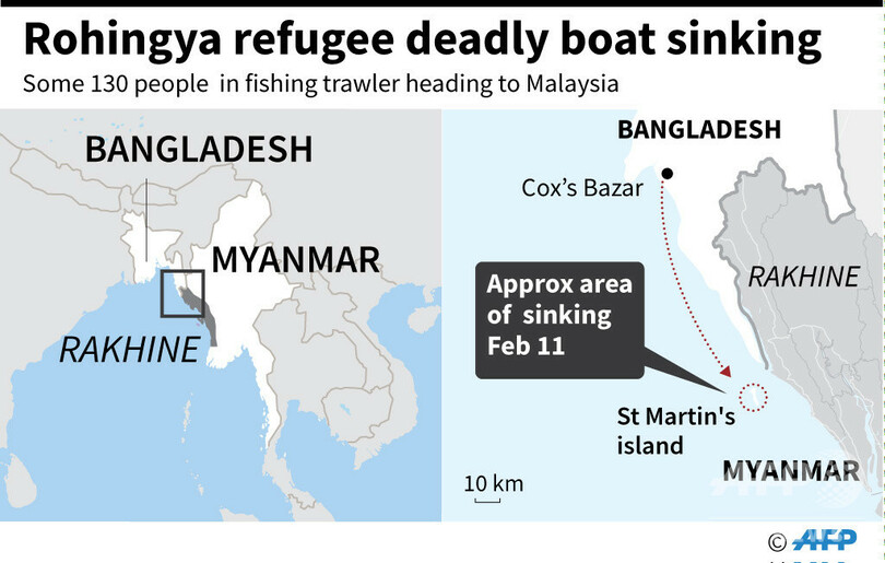 沿岸警備隊の報道官によると、漁船に乗っていたのはロヒンギャ難民らおよそ130人で、ベンガル湾(Bay of Bengal)を通過してマレーシアに向かおうとしていた。これまでに70人が救助されたという。