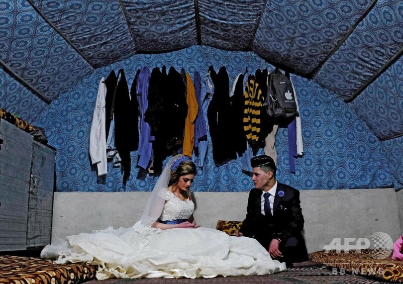 AFPのサフィン・ハメド(Safin Hamed)カメラマンは先日、イラク北西部ドホーク(Dohuk)市近郊の避難民キャンプで暮らしていた、少数派ヤジディー教徒の若いカップルの結婚式に同行した。結婚式はドホーク市の簡素なホールで行われた。