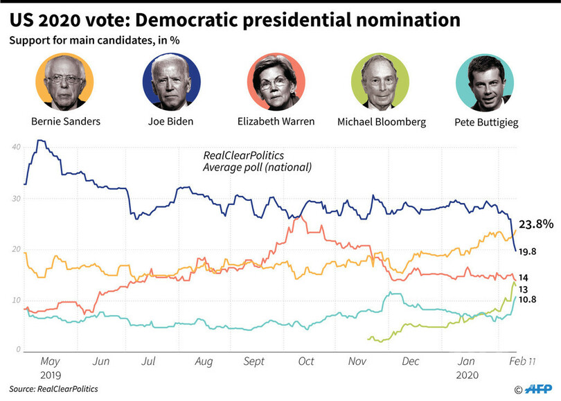 政治サイト「リアル・クリア・ポリティクス(RealClearPolitics)」がまとめた全国規模での世論調査でも支持率はサンダース氏23%、バイデン氏20.4%となり、ニューハンプシャー大学(University of New Hampshire)のダンテ・スカラ(Dante Scala)教授は「有権者はバイデン氏のことを十分に好んではいるが、献身的な支持ではなかった」と指摘している。