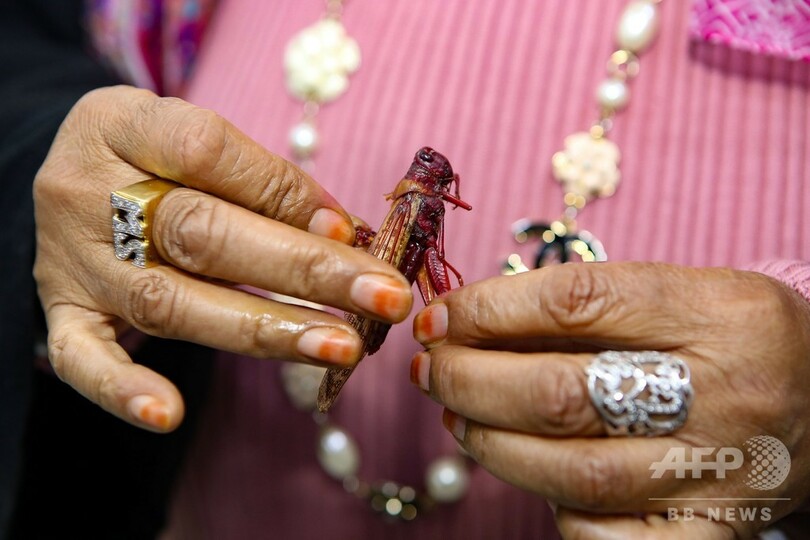 一方、当局はイナゴが汚染されている懸念があることから消費を禁止しようと模索しているが、今のところ実現していない。またイナゴは繁殖力が強く、大群となって作物に被害を与えるため、一部の国々では殺虫剤を使った処分を余儀なくされている。(c)AFP/Salima LEBEL