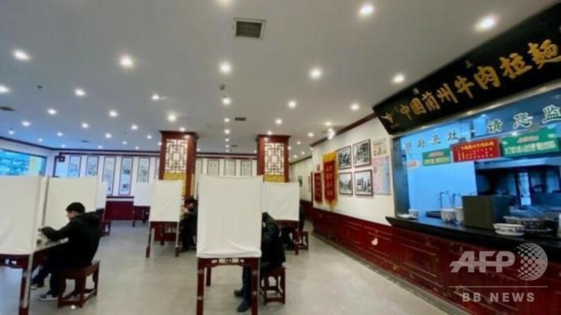 新型ウイルス対策としてテーブルを囲って「個室」にした甘粛の牛肉麺店