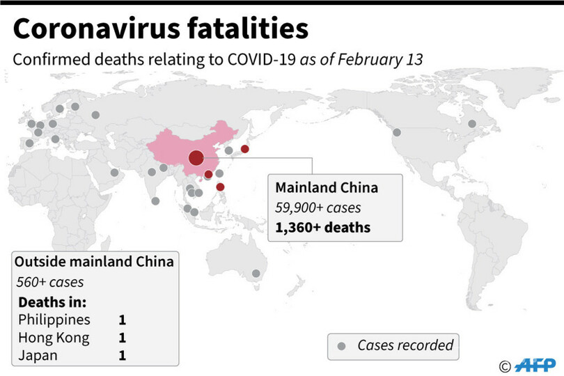 13日現在で、6万人近くの感染を確認。感染者の大部分と死者1367人の大半は武漢市内とその周辺地域に集中しているが、首都北京など他地域でも複数の人が亡くなっている。