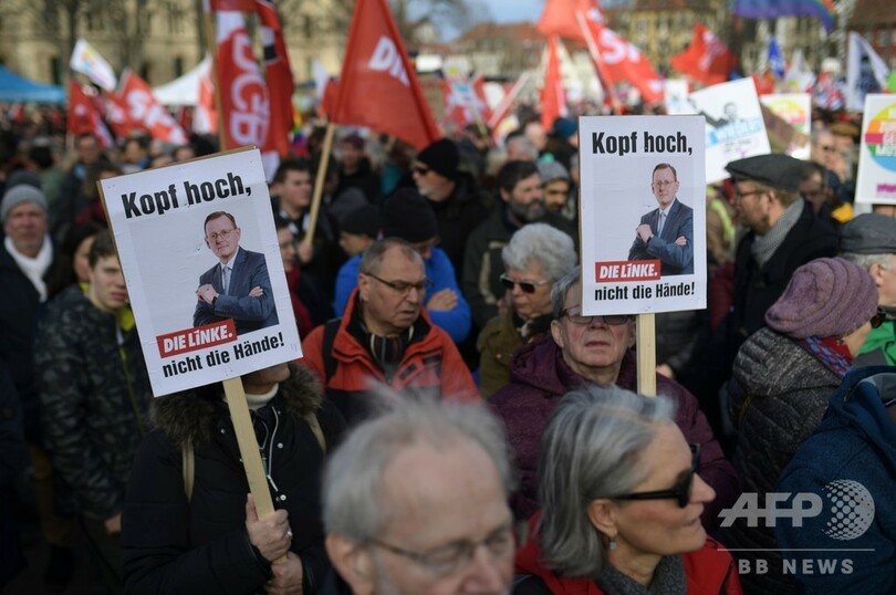 【2月16日 AFP】 ドイツ東部テューリンゲン(Thuringia)州の州首相選挙で、アンゲラ・メルケル(Angela Merkel)首相率いる中道右派キリスト教民主同盟(CDU)の候補が、極右政党の支持を受けて当選したことに対し州都エアフルト(Erfurt)で15日、抗議デモが行われ、約1万8000人が参加した。当選した候補は、州首相に就任した翌日の今月6日に、すでに辞任している。