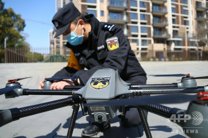 ドローンの高速性と行動範囲の広さ、宣伝能力、直接接触を回避できる点を利用し、市民との距離を縮め、感染の予防抑制に役立てている。(c)CNS/JCM/AFPBB News