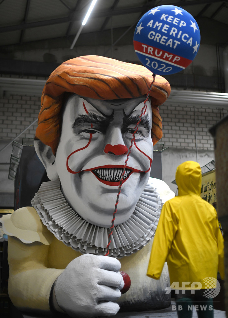 【2月23日 AFP】ドイツ西部ケルン(Cologne)で、カーニバルの組織委員会が公開した、ドナルド・トランプ(Donald Trump)米大統領と映画のキャラクター「ペニーワイズ(Pennywise)」をモチーフにした山車。(c)AFP