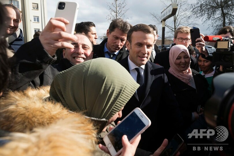 しかし、マクロン氏が演説前に現地視察を行った際、赤紫色のニカブを身に着けた若い女性が、人混みをかき分けて警察官に警護されたマクロン氏に接近。女性がベールをめくると、マクロン氏はいつものように満面の笑みで自撮りに応じた。この場面はカメラで撮影され、直後にソーシャルメディアに投稿された。