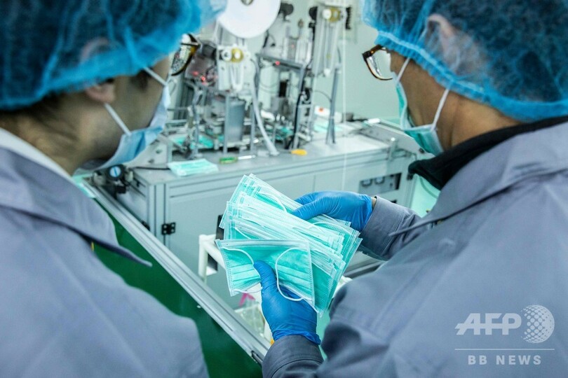 現在はテスト段階だが、クリーンルームに設置した機械で22日から1分当たり60~80枚の医療用マスクを製造できる見通しだ。トンさんによれば、マスクは1枚1~2香港ドル(約14~29円)でネット販売し、購入は1人1箱に限定するという。(c)AFP/Yan Zhao and Katie Forster