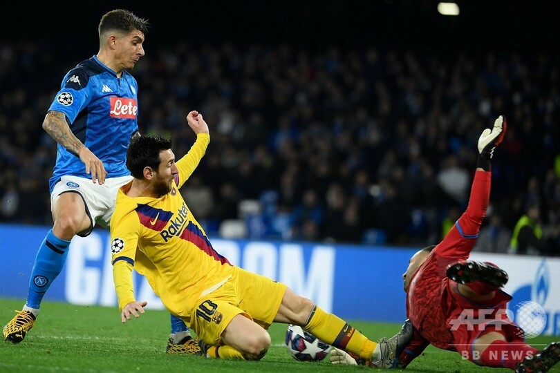 メッシは前週末に行われたSDエイバル(SD Eibar)とのリーグ戦で4ゴールを記録し、チームの首位浮上に貢献していたが、この日はナポリの伝説的選手であるディエゴ・マラドーナ(Diego Maradona)氏が全盛期を送ったサン・パオロ・スタジアム(San Paolo Stadium)に初めて乗り込むも不発。チャンピオンズリーグでの通算ゴール数を114点から伸ばすことはできなかった。(c)AFP