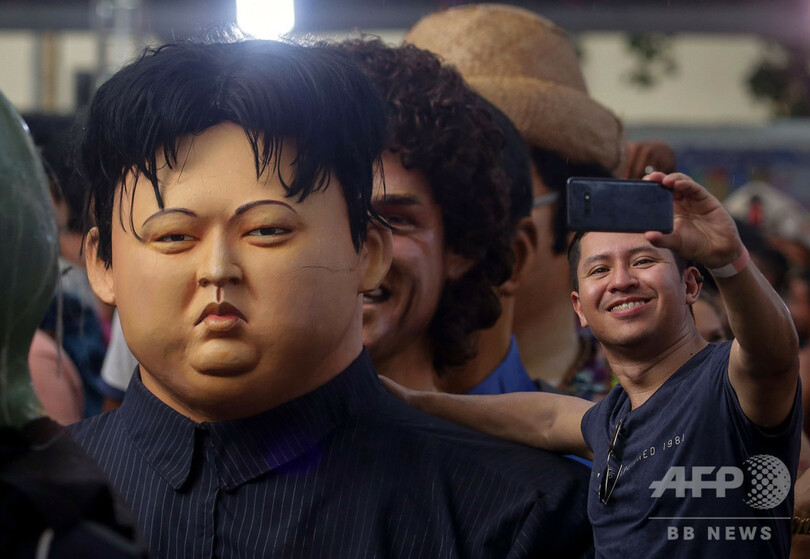 【3月10日 AFP】ブラジル北東部レシフェ(Recife)で行われた伝統的なカーニバルのパレードで、北朝鮮の金正恩(Kim Jong-Un)朝鮮労働党委員長の巨大人形と写真を撮る男性。