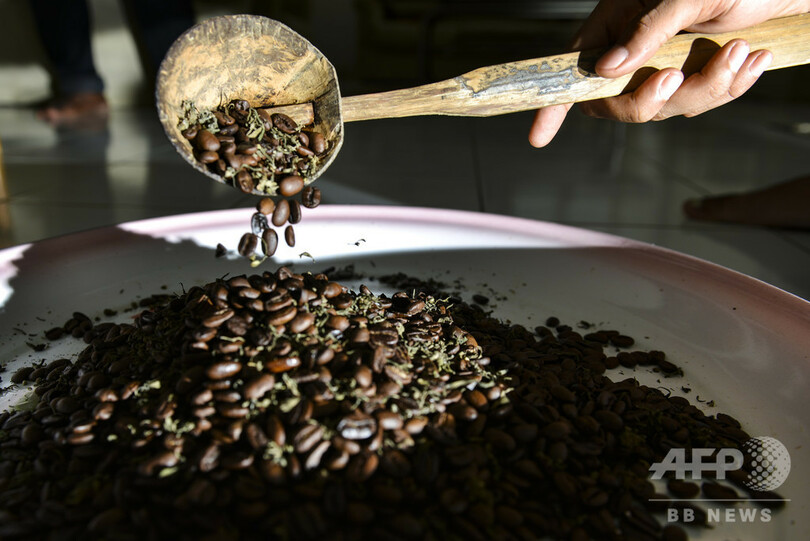 【3月29日 AFP】アグスさん(匿名)は中華鍋にちゅうちょなく木製のへらを入れ、コーヒーとマリフアナ(大麻)をうまく交ぜ合わせながらローストする。