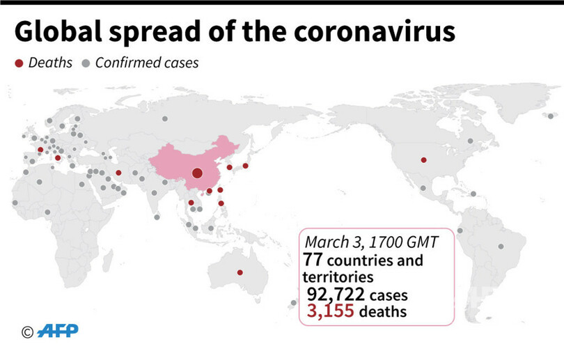 【3月4日 AFP】各国当局の発表に基づきAFPがまとめた統計によると、日本時間4日午前2時現在での世界の新型コロナウイルス感染者数は77か国・地域で9万2722人に達し、うち3155人が死亡した。