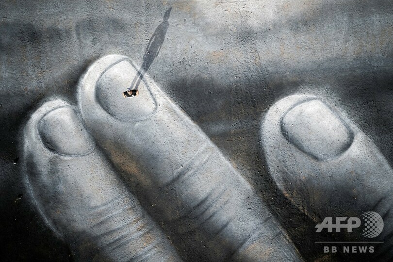 作品は、サイープ氏が手掛ける「ビヨンド・ウオールズ(Beyond Walls、壁を越えて)」プロジェクトの一環で5か所目。象徴的な最長の「人間の鎖」を世界中につくることで、連帯、博愛、寛大といった価値観を広めようとしている。(c)AFP