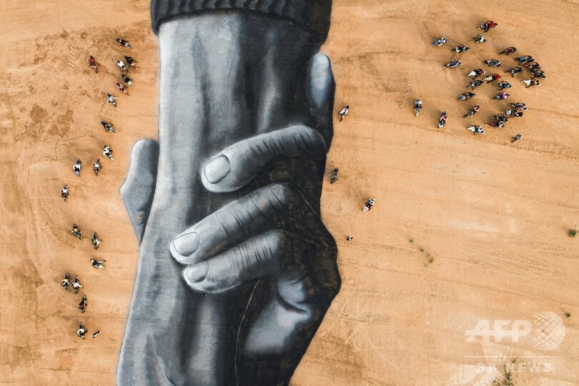 作品は、サイープ氏が手掛ける「ビヨンド・ウオールズ(Beyond Walls、壁を越えて)」プロジェクトの一環で5か所目。象徴的な最長の「人間の鎖」を世界中につくることで、連帯、博愛、寛大といった価値観を広めようとしている。(c)AFP
