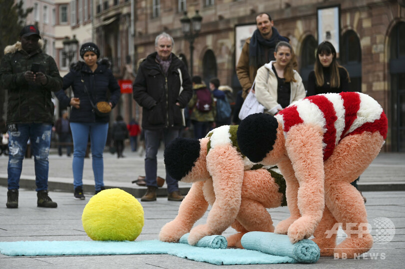 【3月23日 AFP】フランス東部ストラスブールで開催中の「ジブレ(Giboulees)」フェスティバルの一環で、フランス人アーティスト、ココ・プティピエール(Coco Petitpierre)氏とイバン・クレダ(Yvan Cledat)氏が、着ぐるみ姿にビーチボールとタオルを携えて行った「Les baigneurs(水遊びをする人たちの意)」と題されたパフォーマンス。(c)AFP