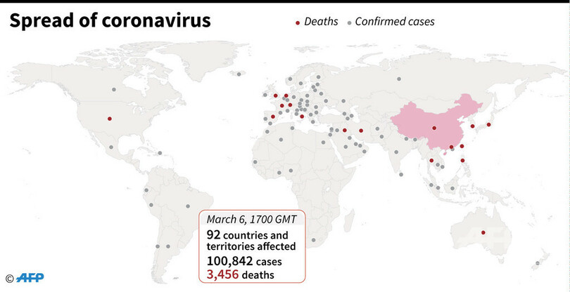 【3月7日 AFP】各国当局の発表に基づきAFPがまとめた統計によると、日本時間7日午前2時現在での世界の新型コロナウイルス感染者数は92の国・地域で10万842人に達し、うち3456人が死亡した。