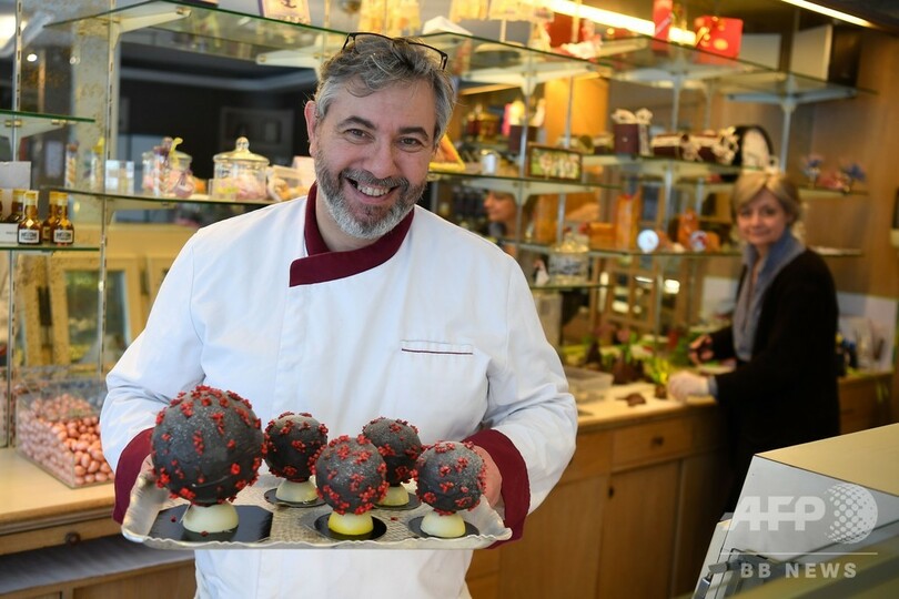 【3月8日 AFP】フランス西部ランディビジオ(Landivisiau)に、新型コロナウイルスの形をしたイースターエッグが登場した。作ったのは、チョコレート職人(ショコラティエ)のジャンフランソワ・プレ(Jean-Francois Pre)さん。ホワイトチョコレートを黒く、アーモンドを赤く着色して作ったという。(c)AFP
