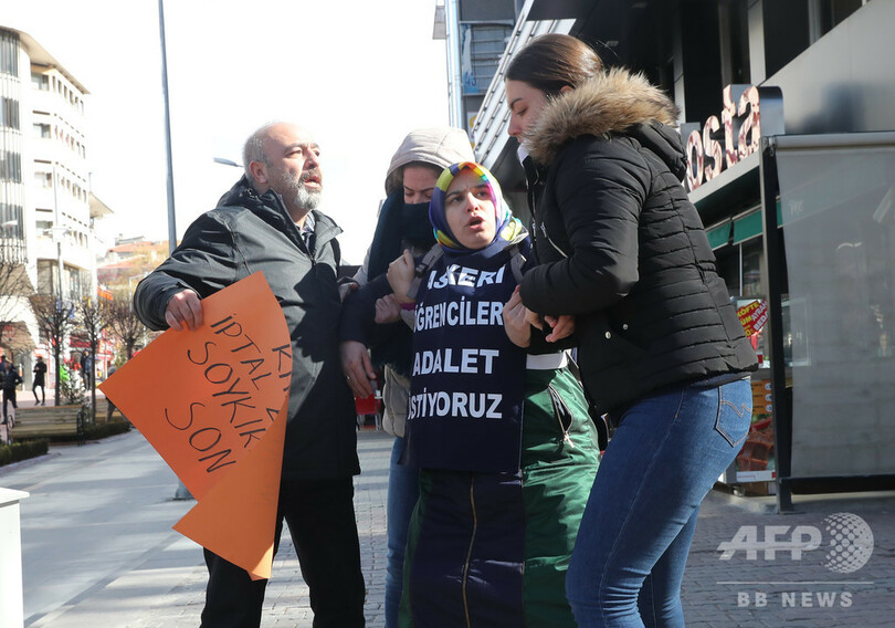 だが、チェティンカヤさんが投獄されている息子のフルカン(Furkan Cetinkaya)さんに正義を要求するベストを着るやいなや、数分もたたずに現れた女性警官2人に無言で腕をつかまれ、すぐに白いバンに押し込まれた。