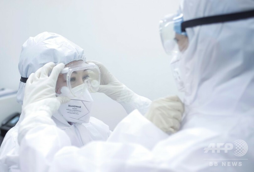 張軒旗(Zhang Xuanqi)さんと韓秋謹(Han Qiujin)さんは、北京鉄路疾病予防医学研究センターの看護師だ。彼女らは自発的に消毒措置チームへの参加を志願し、北京西駅で業務に当たっている。(c)CNS/JCM/AFPBB News