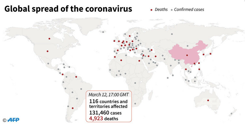 【3月13日 AFP】各国当局の発表に基づきAFPがまとめた統計によると、日本時間13日午前2時現在での世界の新型コロナウイルス感染者数は116の国・地域で13万1460人に達し、うち4923人が死亡した。