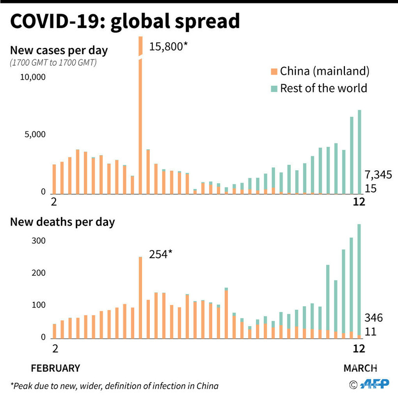 昨年12月末に新型ウイルスが最初に発生した中国では、香港とマカオ(Macau)を除く本土で8万793人が感染し、うち3169人が死亡、6万2793人が回復した。12日午前2時以降、新たに15人の感染と11人の死亡が確認された。