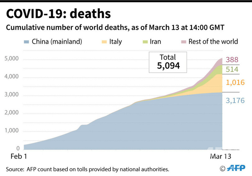 AFPの集計によると、世界の新型コロナウイルス感染者は13万4000人以上で、死者は5000人を超えた。
