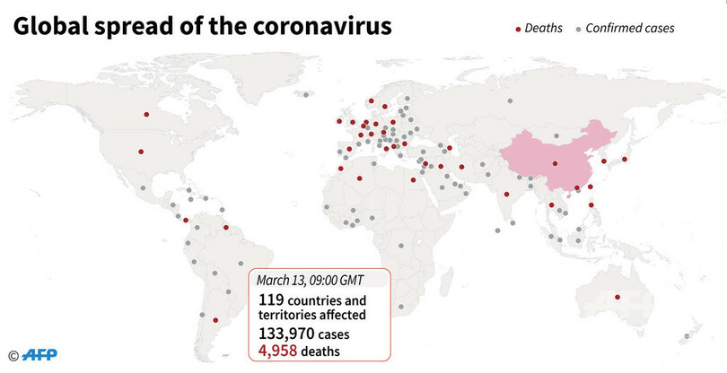AFPの集計によると、世界の新型コロナウイルス感染者は13万4000人以上で、死者は5000人を超えた。