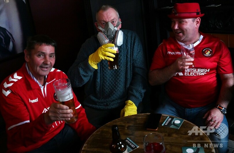 試合開始前にサポーターの集まるパブを訪れたハリファクスファンの男性は「なんだか現実感がないね」「試合の予定表を見ていても、欧州の各国で延期や中止が決まっている」「その中で、ナショナルリーグやいくつかのリーグがまだやっているのを見るのは、ずいぶん妙な感じだよ」と話した。(c)AFP/Steven GRIFFITHS