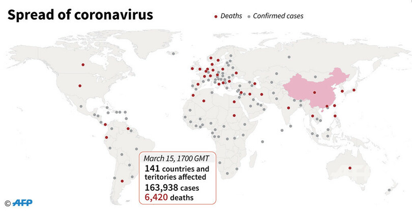 【3月16日 AFP】各国当局の発表に基づきAFPがまとめた統計によると、日本時間16日午前2時現在での世界の新型コロナウイルス感染者数は141の国・地域で16万9390人に達し、うち6420人が亡くなった。