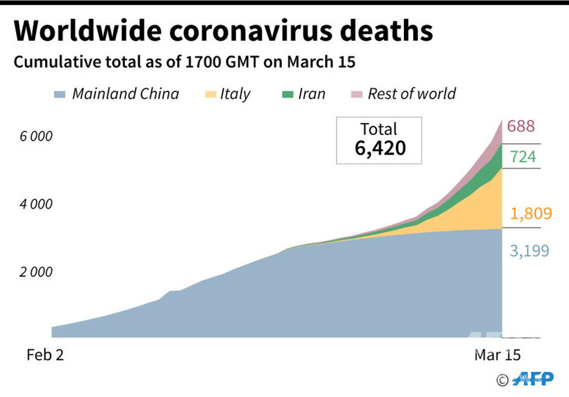 16日午前2時時点の地域別感染者数はアジアが9万1973人(死者3320人)、欧州が5万2407人(死者2291人)、中東が1万5291人(死者738人)、米国・カナダが3201人(死者52人)、中南米・カリブ海(Caribbean Sea)諸国が448人(死者6人)、アフリカが315人(死者8人)、オセアニアが303人(死者5人)となっている。