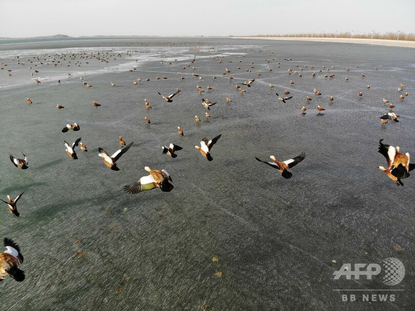 【3月20日 CNS】中国・甘粛省(Gansu)武威市(Wuwei)民勤県(Minqin)にあるアジア最大の砂漠の湖「紅崖山(Hongyashan)ダム」。湖面の氷雪が解け、水鳥が飛び交っていた。(c)CNS/JCM/AFPBB News
