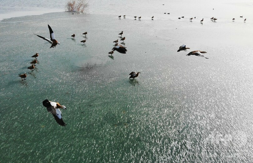 【3月20日 CNS】中国・甘粛省(Gansu)武威市(Wuwei)民勤県(Minqin)にあるアジア最大の砂漠の湖「紅崖山(Hongyashan)ダム」。湖面の氷雪が解け、水鳥が飛び交っていた。(c)CNS/JCM/AFPBB News