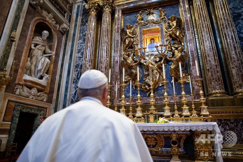 しかしローマ教皇庁(バチカン)によると、教皇はこの日、同市のサンタマリアマジョーレ大聖堂(Basilica of Santa Maria Maggiore)を訪問。その後「巡礼に出るかのように徒歩で」サンマルチェロアルコルソ教会(San Marcello al Corso Church)まで歩いたという。