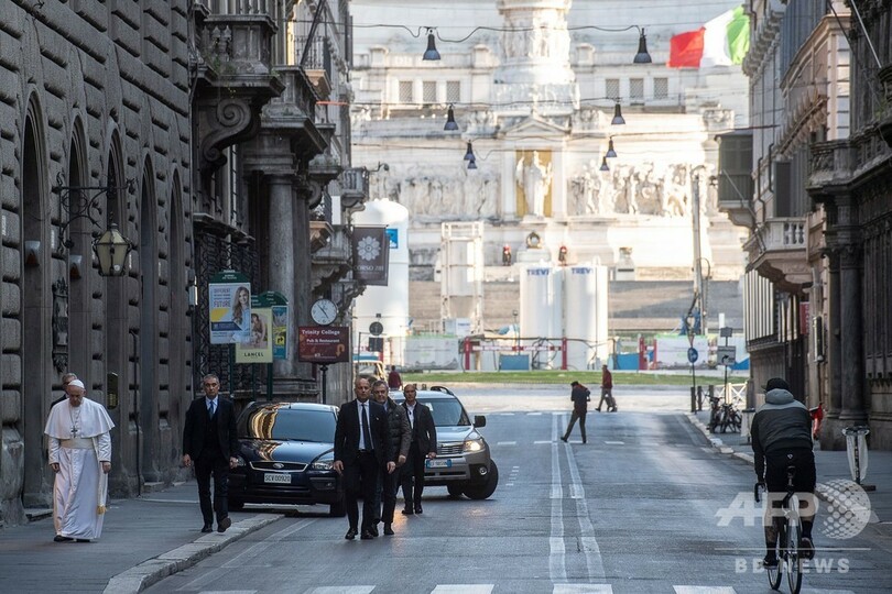 【3月16日 AFP】ローマ・カトリック教会のフランシスコ教皇(Pope Francis、83)は15日、バチカン市国を出てイタリアの首都ローマ市内に赴き、事前の予告なくある教会を訪れて祈りをささげた。イタリアではこの日、新型コロナウイルスによる死者数が1日としてはこれまでで最も多い368人に上った。