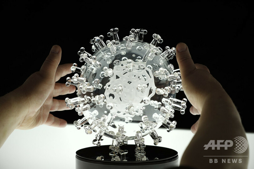 パンデミック(世界的な大流行)に立ち向かう科学と医学における世界中の多大な努力に敬意を表して作られた。大きさは、実物のウイルスの200万倍に当たる直径23センチ。(c)AFP