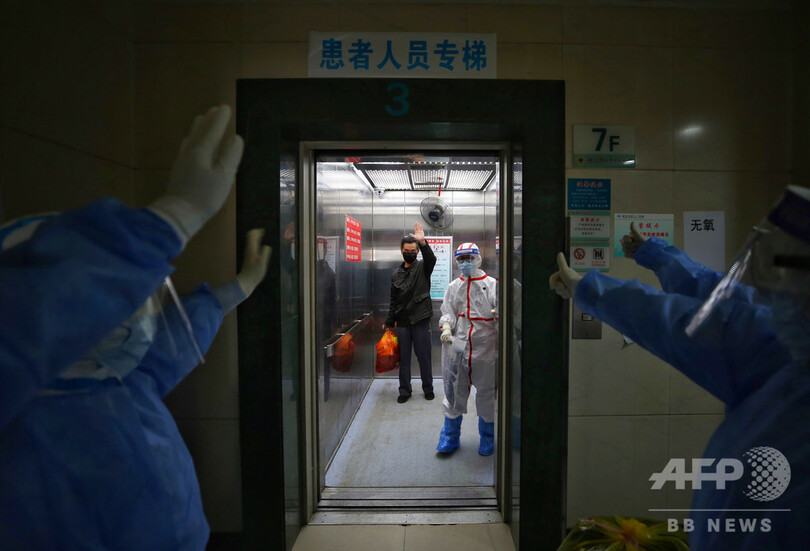 【3月24日 AFP】中国・湖北(Hubei)省武漢(Wuhan)の赤十字病院(Red Cross Hospital)で、新型コロナウイルス感染症(COVID-19)から回復し、退院する人に別れのため手を振る医療スタッフ。(c)AFP