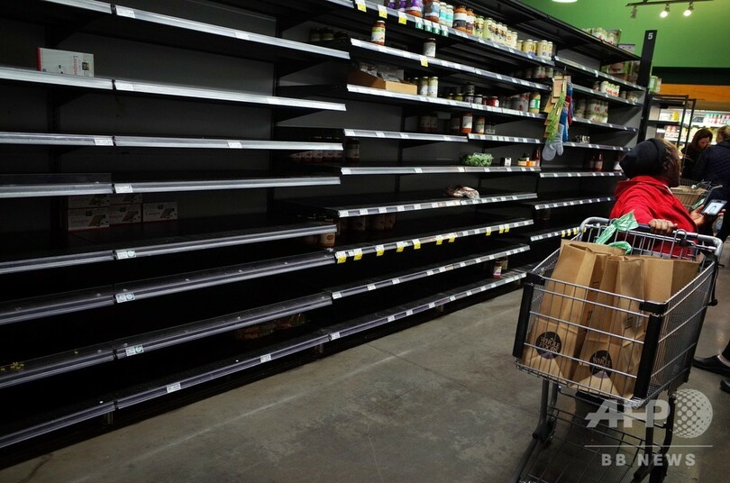 新型ウイルスの感染拡大を受けて、外国だけでなく米国各地でもパニック買いが発生。スーパーマーケットではしばしば、手指用の消毒液やミネラルウオーター、トイレットペーパーなどの商品が売り切れている。