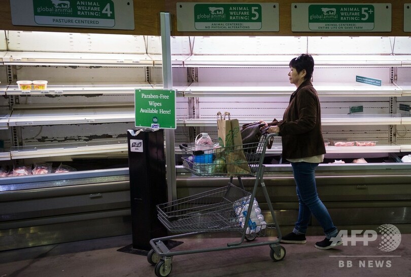 新型ウイルスの感染拡大を受けて、外国だけでなく米国各地でもパニック買いが発生。スーパーマーケットではしばしば、手指用の消毒液やミネラルウオーター、トイレットペーパーなどの商品が売り切れている。
