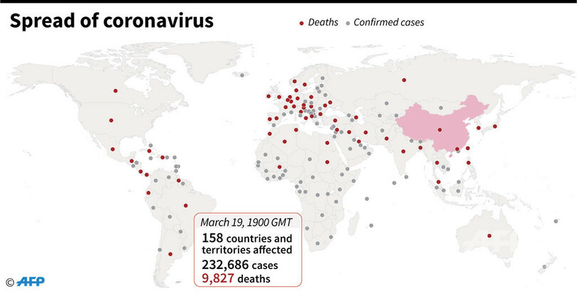 【3月20日 AFP】各国当局の発表に基づきAFPがまとめた統計によると、日本時間20日午前4時現在での世界の新型コロナウイルス感染者数は158の国・地域で23万2680人に達し、うち9827人が亡くなった。