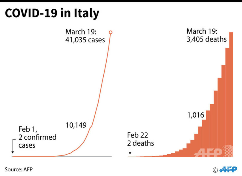 中国以外で被害が大きな国は、イタリア(死亡3405人、感染4万1035人)、イラン(死亡1284人、感染1万8407人)、スペイン(死亡767人、感染1万7147人)、フランス(死亡372人、感染1万995人)。